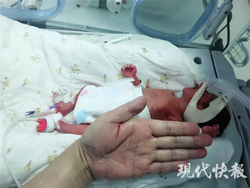 6月9日夜間,揚州市婦幼保健院新生兒科病房接到電話:“快!產(chǎn)房一個懷孕26+6周的產(chǎn)婦即將分娩!”值班醫(yī)生劉偉偉迅速趕到產(chǎn)房,不一會,該產(chǎn)婦娩出一男嬰。出生時的小寶寶全身皮膚薄嫩,呈現(xiàn)膠凍狀,血管清晰可見,身長僅33cm,頭圍21cm,體重僅有890g,自主呼吸微弱,皮膚青紫,并出現(xiàn)輕度窒息。劉偉偉立刻進行窒息復(fù)蘇,很快小寶寶自主呼吸恢復(fù),皮膚轉(zhuǎn)紅,復(fù)蘇成功。此時,新生兒科病房里,護理人員已經(jīng)準備好了高級暖箱,調(diào)好了箱溫和濕度,監(jiān)護單元的各項設(shè)備都已就位,隨時迎接小寶寶的到來。