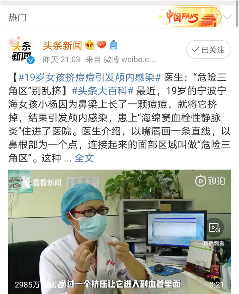 △浙江寧波一19歲女孩擠痘引發(fā)顱內(nèi)感染的新聞沖上熱搜