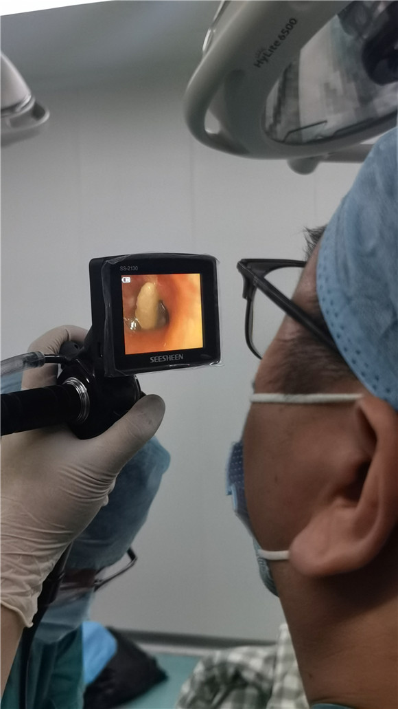 當(dāng)天下午手術(shù)正式開(kāi)始,電子支氣管鏡順利進(jìn)入患者氣道,發(fā)現(xiàn)假牙嵌頓于右主支氣管,右肺通氣功能幾近喪失。在劉盼盼的協(xié)助下,楊旸用異物鉗夾住假牙尖端,假牙有松動(dòng)但無(wú)法直接鉗出。隨后決定更換圈套器,圈住假牙的中間部位,收緊圈套器固定住假牙,將假牙與氣管套管一起取出。最后,楊旸使用電子支氣管鏡二次進(jìn)入氣道,見(jiàn)假牙嵌頓處已有肉芽組織生成,給予鏡下清理肉芽組織和分泌物后退鏡結(jié)束操作,整個(gè)操作過(guò)程不超過(guò)五分鐘。復(fù)蘇后,患者呼吸困難得到顯著改善。