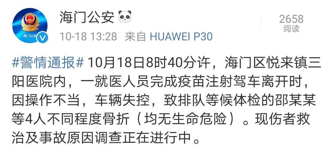 當(dāng)日,海門公安通過官方微博發(fā)布警情通報。通報內(nèi)容顯示,10月18日8時40分許,海門區(qū)悅來鎮(zhèn)三陽醫(yī)院內(nèi),一就醫(yī)人員完成疫苗注射駕車離開時,因操作不當(dāng),車輛失控,致排隊等候體檢的邵某某等4人不同程度骨折(均無生命危險)。目前傷者救治及事故原因調(diào)查正在進行中。