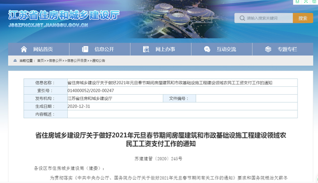 (實(shí)習(xí)生 黃鈺曄 記者 張瑜)近日,江蘇省住房和城鄉(xiāng)建設(shè)廳發(fā)布《關(guān)于做好2021年元旦春節(jié)期間房屋建筑和市政基礎(chǔ)設(shè)施工程建設(shè)領(lǐng)域農(nóng)民工工資支付工作的通知》(以下簡(jiǎn)稱《通知》),要求各地切實(shí)做好元旦春節(jié)期間農(nóng)民工工資支付工作,保障農(nóng)民工合法權(quán)益?!锻ㄖ访鞔_,加大拖欠工程款和工資查處力度,對(duì)不主動(dòng)落實(shí)、不積極配合有關(guān)部門解決拖欠農(nóng)民工工資問(wèn)題,引發(fā)群體性事件并造成嚴(yán)重后果的有關(guān)單位和責(zé)任人,要進(jìn)行約談、通報(bào)和問(wèn)責(zé)。