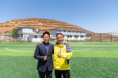 視角來到室外,由中國女足援建的標(biāo)準(zhǔn)化足球場,綠意盎然,宛如云端上的一顆綠寶石。球場上,支教老師崔老師正帶著象寶足球隊(duì)火熱訓(xùn)練中,運(yùn)營團(tuán)隊(duì)和愛心人士有幸在一旁全程觀摩。