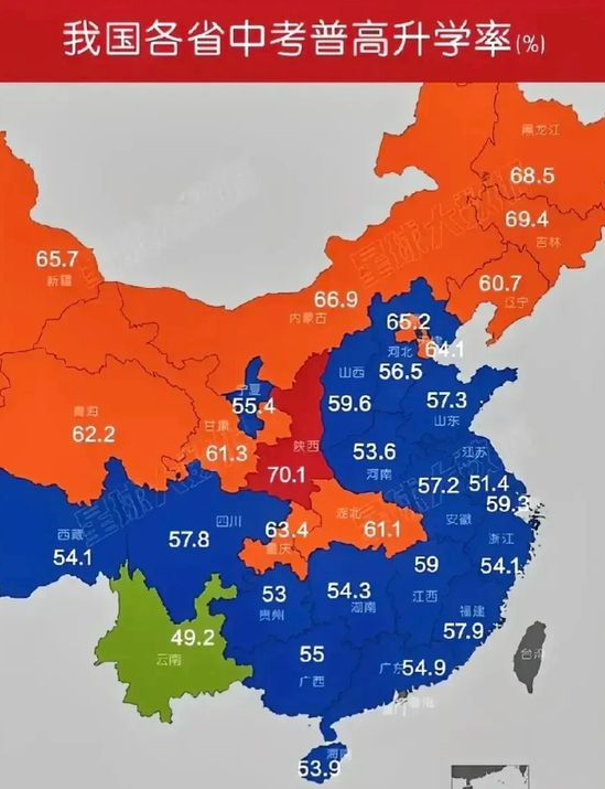 我國各省中考普高升學(xué)率,大家發(fā)現(xiàn)沒有,北方省份中考普高升學(xué)率普遍高于60%,而南方省份普高升學(xué)率普遍低于60%。