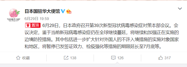 昨日,日本駐華大使館也發(fā)布了針對(duì)中國人的最新措施:針對(duì)新冠肺炎疫情在國外疫情擴(kuò)大的現(xiàn)狀,日本政府決定在現(xiàn)階段政策實(shí)施的基礎(chǔ)上,采取以下措施: