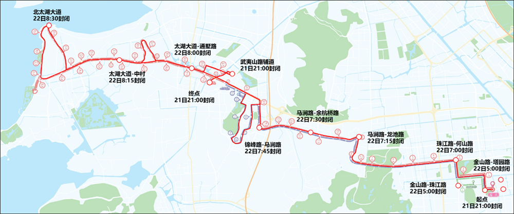 何山路(支英街至華楓路段)、何山路隧道、龍池西路(馬澗路至寒山路段)、馬澗路(馀杭橋路至龍池西路段)、馬澗路(錦峰路至馀杭橋路)、錦峰路(太湖大道至馬澗路段)、太湖大道輔道(嘉陵江路至健雄路段)、玉屏路(光啟路至景潤路段)、太湖大道(貢山路至錦峰路段)、太湖大道(北太湖大道至貢山路段)、太湖大道(貢山路至嘉陵江路段)封閉屬于賽道的半幅路面,禁止所有車輛、非參賽行人在賽道內通行。所有涉及賽道的道路(半幅或全幅)禁止車輛停放(含路內停車泊位)。