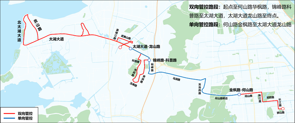 科技城片區(qū)南北向通行車輛可通過松花江路、瀟湘路下穿通道繞行;東西向通行車輛可通過科研路、陽山西路繞行至太湖大道;