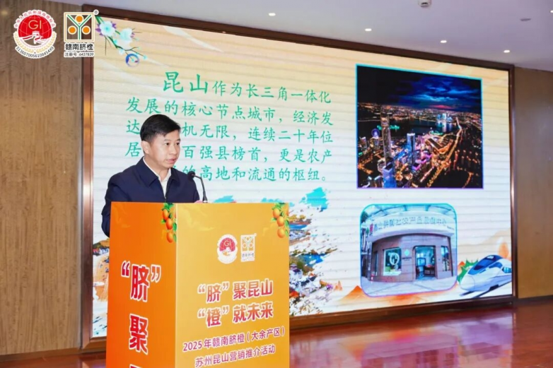 蘇州市政府機關殷明在致辭中對本次推介活動的舉辦給予高度肯定,他表示,昆山作為長三角一體化發(fā)展核心節(jié)點城市與全國百強縣榜首,既是農產品消費高地,也是流通樞紐,大余贛南臍橙的優(yōu)質品質與昆山的市場優(yōu)勢高度契合,期待兩地以本次活動為契機,深化產業(yè)聯(lián)動,實現資源共享。