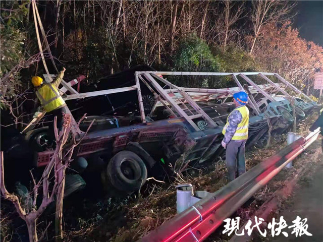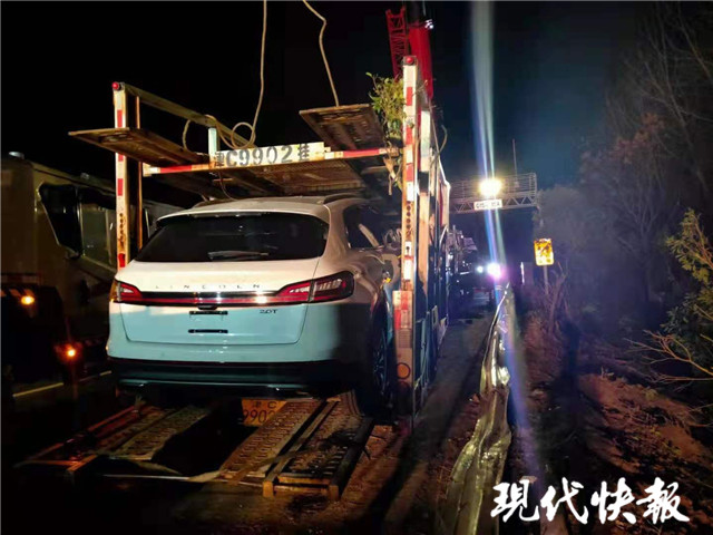 12月9日18時(shí)許,接到報(bào)警后民警到達(dá)事故現(xiàn)場,發(fā)現(xiàn)一輛15米多長的運(yùn)輸車側(cè)翻在護(hù)欄外的綠化帶,車頭已經(jīng)凹下去了一半,運(yùn)輸?shù)?輛林肯SUV已經(jīng)被甩出,損壞嚴(yán)重,應(yīng)急車道邊上的護(hù)欄也被撞得脫落,現(xiàn)場一片狼藉。