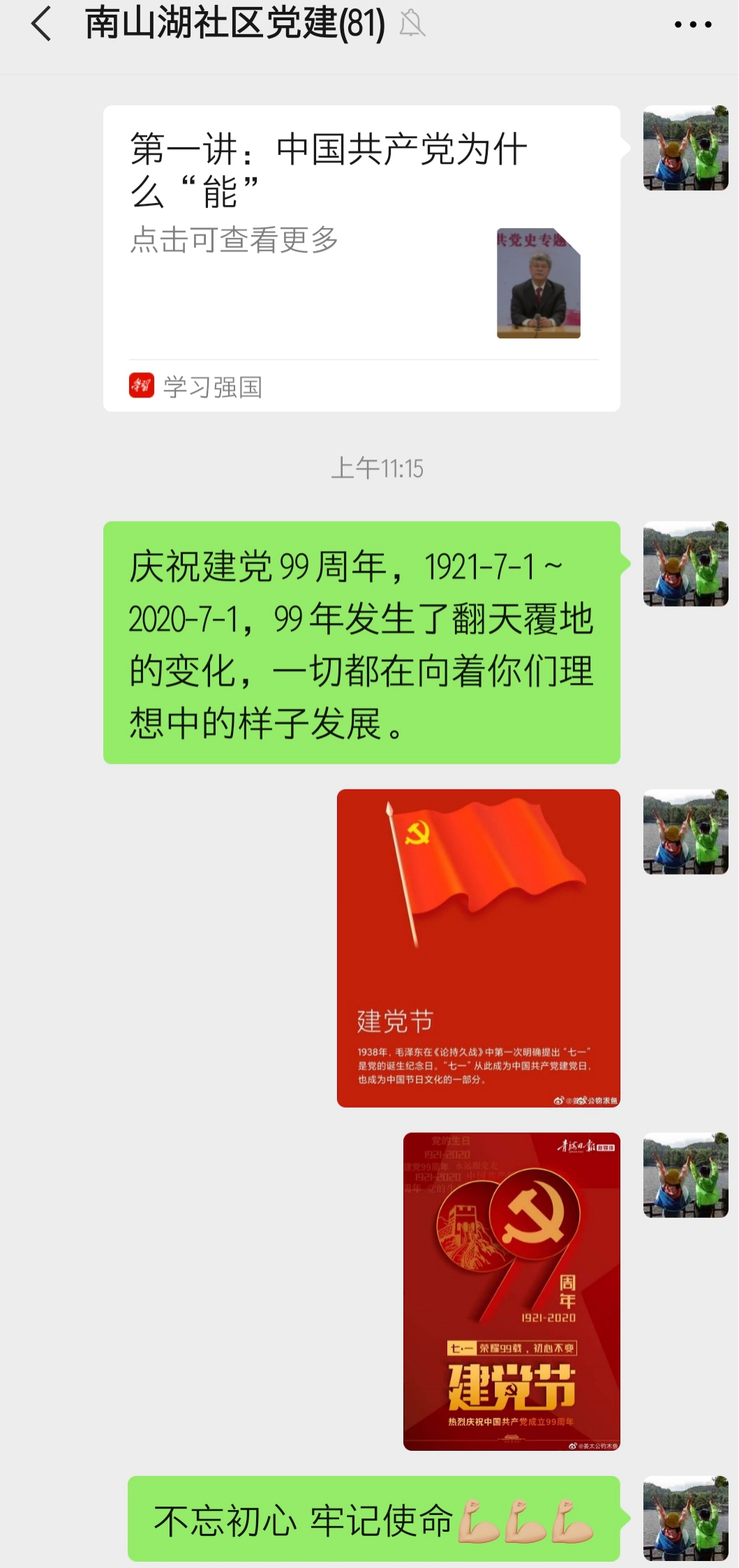 特殊時(shí)期,秉著確保黨組織工作正常有序開展的原則,南山湖社區(qū)通過在黨員群里發(fā)送黨史學(xué)習(xí)視頻,展開線上黨員大會(huì),同時(shí),全面進(jìn)行微信推廣學(xué)習(xí),動(dòng)員工作繁忙的黨員一起參與到黨史學(xué)習(xí)中,從“中國之治”到道路自信、理論自信、制度自信、文化自信,希望廣大黨員向先進(jìn)典型學(xué)習(xí)看齊,比學(xué)趕超,加壓奮進(jìn),在社區(qū)全面爭先創(chuàng)優(yōu)的工作中建功立業(yè)、展示風(fēng)采。這樣的黨員大會(huì)誠意滿滿、干貨滿滿,在新媒體的助力下,將黨課搬到網(wǎng)上,搬進(jìn)了黨員家里,讓黨課入腦入心,取得了很好的教育效果。
