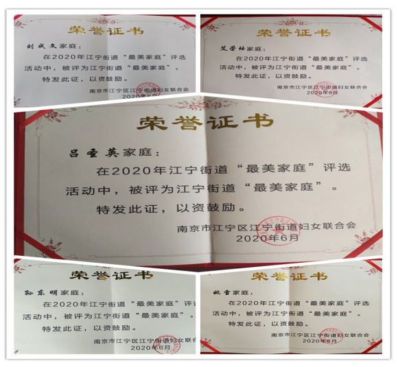 百善孝為先,她用柔弱的肩膀撐起整個(gè)家庭;新型冠狀肺炎來(lái)勢(shì)洶洶,她逆向而行,無(wú)私奉獻(xiàn);一名黨員就是一面旗幟,他用實(shí)際行動(dòng)支持并參與防疫戰(zhàn)斗,發(fā)揮黨員先鋒模范作用。在今年的最美家庭評(píng)選中,新銅社區(qū)5戶家庭分別榮獲2020年度江寧區(qū)江寧街道“孝老愛(ài)親”、“抗議先鋒”、“黨員示范”最美家庭榮譽(yù)稱號(hào),其中2戶家庭獲得區(qū)級(jí)最美家庭榮譽(yù)稱號(hào)。