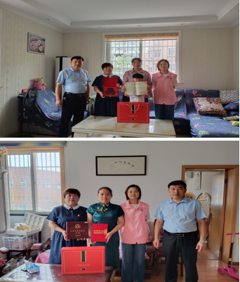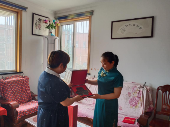 7月1日上午,新銅社區(qū)黨委副書(shū)記陳建康、婦聯(lián)主席魏秀香帶領(lǐng)工作人員、志愿者前往呂圣英、艾榮玨、孫東明、姚雪、劉成文家中,為他們頒發(fā)榮譽(yù)證書(shū)及獎(jiǎng)牌,獻(xiàn)上祝福。