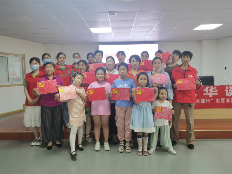 活動(dòng)開始,首先由老黨員分享《我和共產(chǎn)黨的故事》。在座的孩子們都紛紛表示,要好好學(xué)習(xí),繼承我黨優(yōu)秀傳統(tǒng),練就硬本領(lǐng),做建設(shè)祖國(guó)的合格接班人。接著是志愿者共同朗誦《七月的天空》詩(shī)歌,使大家知道七月的天空格外紅,它是九十九年無數(shù)革命英雄拋頭顱灑熱血換來的,今天我們?cè)谄咴碌奶炜障拢拺严攘?,感恩中?guó)共產(chǎn)黨。為了讓孩子們對(duì)中國(guó)共產(chǎn)黨有更深刻的認(rèn)識(shí),志愿者老師又給大家認(rèn)真講解了黨旗的含義,孩子們聽得津津有味,都迫不及待的想親手繪畫黨旗。于是,社區(qū)老黨員、家長(zhǎng)及志愿者與孩子們一起共同攜手繪畫黨旗。當(dāng)一面面鮮紅的“黨旗”完成時(shí),大家高高舉起自己的作品,無比的開心與自豪!活動(dòng)最后,大家齊唱紅歌,有奶奶也有孩子伴舞,老少同臺(tái),童心同聚,為慶建黨九九華誕而歡呼著。