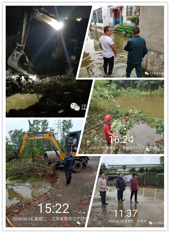 6月15日,因連降大暴雨以及各個防汛機臺向外河排洪,江寧河水勢上漲迅速。面對湍急、上漲的河水,上湖村經(jīng)過對杭家居住在外圍的村民家水情調(diào)查,迅速組織抗洪搶險突擊隊,對杭家組即將受淹的居民進行搬家具;聯(lián)系勸離不在家的村民;安撫村民情緒;解決村民食宿問題,急百姓所急。潮水退下后,上湖村組織人員與受淹群眾一起清理淤泥,整理家務,并進行消毒處理。
