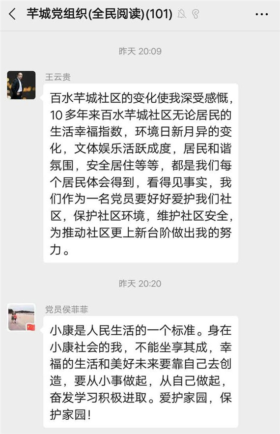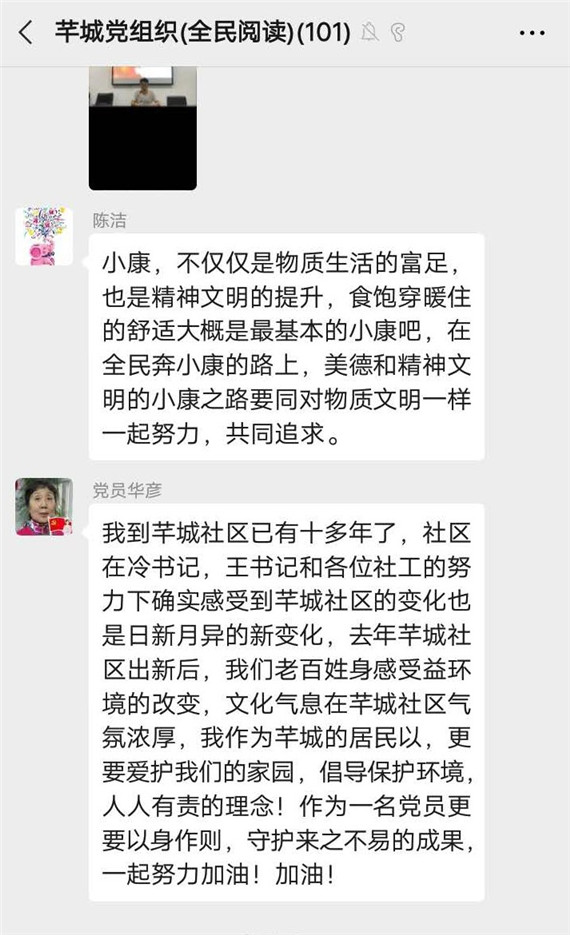 文章內(nèi)容講述了百水芊城居民自拆遷入住后向小康之路邁進的一系列動人故事,回溯歷史變遷、闡述發(fā)展新貌,短短二十年間,從草房、平房到樓房,從步行到汽車代步、便捷的公共交通,從單一種類到豐富多樣的食物內(nèi)容,從“老、破、小”的城中村到紫東建設(shè)高地,對于馬群人來說,小康的意義正內(nèi)化于這一粥一飯、半絲半縷之間,滲透到我們生活的方方面面。閱讀完故事內(nèi)容后,社區(qū)居民也深有感觸,紛紛講述自己眼中的小康生活和對即將全面建成小康社會的美好展望,青年人也更是深刻地認識到全面建成小康社會所應(yīng)肩負的重任。