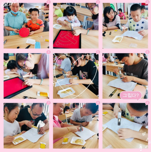 活動開始前,社區(qū)婦聯(lián)的工作人員早早地布置好活動現(xiàn)場,提供交流的平臺,為孩子們創(chuàng)造較好的學(xué)習(xí)環(huán)境?;顒訌囊徊坷想娪啊堕W閃紅星》開始,老師給孩子們講述了《閃閃紅星》中潘東子的事跡,由此引出了本次活動主題——閃閃紅星照我心,帶領(lǐng)孩子們用傳統(tǒng)工藝——弦絲畫,來繞出一顆顆閃閃的紅星和一個個鮮亮的黨徽。