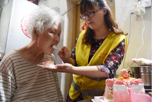 社區(qū)最初計劃將居家養(yǎng)老大廳布置布置,買上生日蛋糕,給老人唱生日歌一同慶賀。根據(jù)社區(qū)便民服務(wù)中心全科社工了解到的情況,劉爺爺?shù)睦习閮宏愑裣慊加芯袢墯埣?,時而清醒、時而糊涂,經(jīng)常性犯病不吃不喝不睡,亂發(fā)脾氣,劉爺爺只能不分白天黑夜地照顧著、陪著她,日日如此,根本沒有自己的時間和空間。考慮到老人身邊離不開人照顧的情況,社區(qū)工作人員貼心的將“生日會場”挪到了老人家中,這一下,老兩口可開心了。劉爺爺將切下的第一塊蛋糕遞給了老伴兒,看著老伴兒心情好的吃著蛋糕,劉爺爺也十分開心,笑的合不攏嘴??粗惸棠套约撼缘馁M勁,志愿者接過蛋糕盤,一口一口將蛋糕喂到老人的口中,為這對特殊的老夫妻過了一個特別的生日。