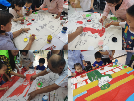 緊接著美術老師向黨員和小朋友介紹了黨建主題畫的色彩元素及含義。黨員和兒童們認真聽完躍躍欲試,開始分組創(chuàng)作,孩子們開心地拿起畫筆,沾上顏料開始涂色:沾了紅色顏料的小朋友涂黨旗、黃色顏料的涂黨徽、彩色的涂黨旗下的孩子們,專心致志地給畫布上色,在黨員和孩子們齊心協(xié)力下,一幅幅精美的畫作躍然紙上。