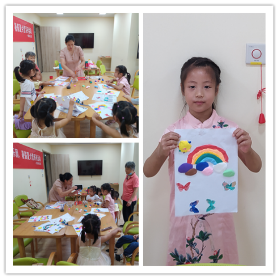 活動(dòng)中,由于針對(duì)的是不同年齡的孩子們,因此志愿者在進(jìn)行溝通交流的基礎(chǔ)上不局限于教材,跳出了英文課程的限制,全程英語(yǔ)教學(xué),通過(guò)結(jié)合社區(qū)現(xiàn)有的手工、書(shū)籍類(lèi)的道具器材寓教于樂(lè),在玩的過(guò)程中教會(huì)孩子們一些相關(guān)的英語(yǔ)術(shù)語(yǔ),鼓勵(lì)少兒積極展示所學(xué)的英語(yǔ)口語(yǔ),‘Hello,boys and girls,Good morning!’…幾句開(kāi)場(chǎng)對(duì)白之后,“英語(yǔ)小實(shí)驗(yàn)”正式開(kāi)始。英語(yǔ)老師和孩子們一起開(kāi)展彩泥、彩繪加水彩變色小實(shí)驗(yàn),并進(jìn)行互動(dòng)問(wèn)答。‘What colors do you see?’‘Green,red,black and yellow.’‘Do you like caterpillar?’‘I do like caterpillar because it’令人驚喜的是,孩子們不僅踴躍發(fā)言,甚至有幾個(gè)孩子說(shuō)的非常好,顯然接受過(guò)良好的英語(yǔ)啟蒙。隨后的交流環(huán)節(jié),老師鼓勵(lì)孩子們用英語(yǔ)介紹自己家庭成員、平時(shí)喜歡的小動(dòng)物、玩具等內(nèi)容‘This is a box,and that is a cat.’‘I made a candy and a butterfly.’稚嫩的童聲說(shuō)起英語(yǔ)來(lái),尤其悅耳。孩子們最后一起分享了最喜歡的一首英文兒歌,在愉快的歌聲中結(jié)束了本次英語(yǔ)角活動(dòng)。