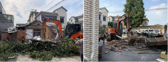 居民小區(qū)違規(guī)亂建嚴(yán)重影響了居民群眾的生活水平和社區(qū)的環(huán)境面貌。為保證此次拆違工作順利進(jìn)行,網(wǎng)格員們仔細(xì)排查,按照先勸導(dǎo)后拆除的原則,勸導(dǎo)其同意對私搭亂建進(jìn)行拆除和建筑垃圾清理。拆違現(xiàn)場,社區(qū)采取人工和機(jī)械作業(yè)相結(jié)合的方法進(jìn)行,調(diào)來挖掘機(jī)、鐵鍬等拆違工具,將違章建筑墻體、護(hù)欄等拆除出來,并將拆除違建留下的垃圾集中搬運(yùn)上車,清理出來的雜物裝了整整一大卡車。經(jīng)過一番清理后,社區(qū)環(huán)境逐漸顯露出靚麗的容顏。