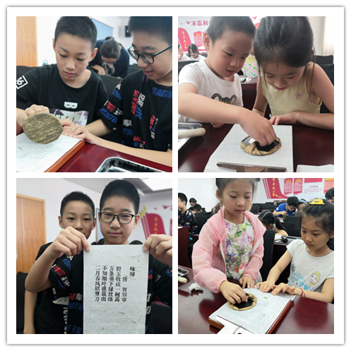 活動(dòng)在學(xué)習(xí)兒童禮儀知識(shí)中拉開了序幕,志愿者老師為孩子們講授活字印刷術(shù)的文明歷史及發(fā)明歷程,讓孩子們對(duì)活字印刷術(shù)有基本了解。接著講解活字印刷術(shù)的制作過程,現(xiàn)場(chǎng)提問聲此起彼伏,對(duì)接下來(lái)的操作環(huán)節(jié)充滿了期待。在老師的指導(dǎo)下,孩子們用手中的工具開始制作,首先制成單字的陽(yáng)文反文字模,然后按照自己需要的語(yǔ)句或文章把單字挑選出來(lái),排列在字盤內(nèi),涂墨印刷。印完后再將字模拆出,留待下次排印時(shí)再次使用。一筆一墨一丹青,一紙一字一發(fā)明,看到自己親手制作的一首首古詩(shī)詞成品躍然紙上,孩子們露出滿意的笑容,迫不及待與朋友、家人分享。