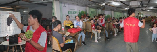 活動伊始,農(nóng)場技術人員為親子家庭講解葡萄的品種、類型、味道、品質,種植技術、怎樣管理和挑選等知識,使得參加活動的親子家庭對葡萄產(chǎn)業(yè)的產(chǎn)、供、銷等有了更深的了解。隨后,在農(nóng)場技術人員帶領下,大家拎著籃子,拿著剪刀,穿過葡萄架下的小道,直奔葡萄園。八月正是葡萄成熟的季節(jié),走進葡萄園中,已是一副“蒼藤蔓,架覆前檐,滿綴明珠絡索園”的美麗景象。聽完技術人員對土壤的物質循環(huán)介紹和采摘過程中的技巧及注意事項后,大家便迫不及待地體驗采摘快樂,每人都盡情呼吸著田園的氣息,暢享著大自然賜予的豐碩成果。