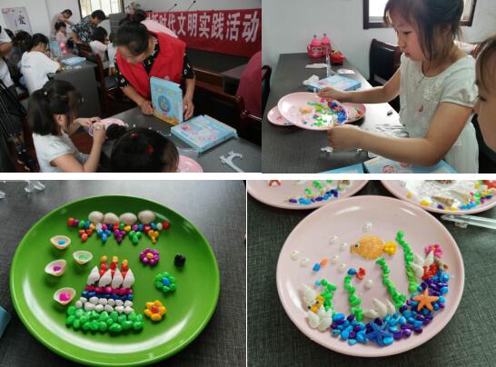 活動伊始,指導(dǎo)老師和志愿者首先向大家展示已完成的貼盤作品,色彩斑斕、充滿創(chuàng)意的貼盤瞬間勾起了大家學(xué)習(xí)的興趣。接著,老師開始講解演示貼盤制作的步驟和方法,在家長們的引導(dǎo)和協(xié)作下,孩子們用靈巧的雙手將腦里的奇思妙想,如海底世界、叢林、藍天都活靈活現(xiàn)地呈現(xiàn)在貼盤上。用貝殼拼湊成魚的模樣、將多彩的石子變化出沙灘、海藻和花朵。“紅色的石頭加上潔白的貝殼更好看……”孩子和父母認真討論,相互配合,手隨心動,一個個創(chuàng)意十足、獨特美觀的貼盤作品悄然呈現(xiàn),大家拿著自己的作品相互欣賞,并合影留念。