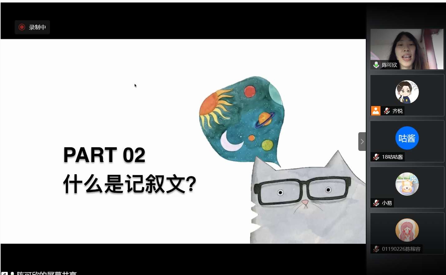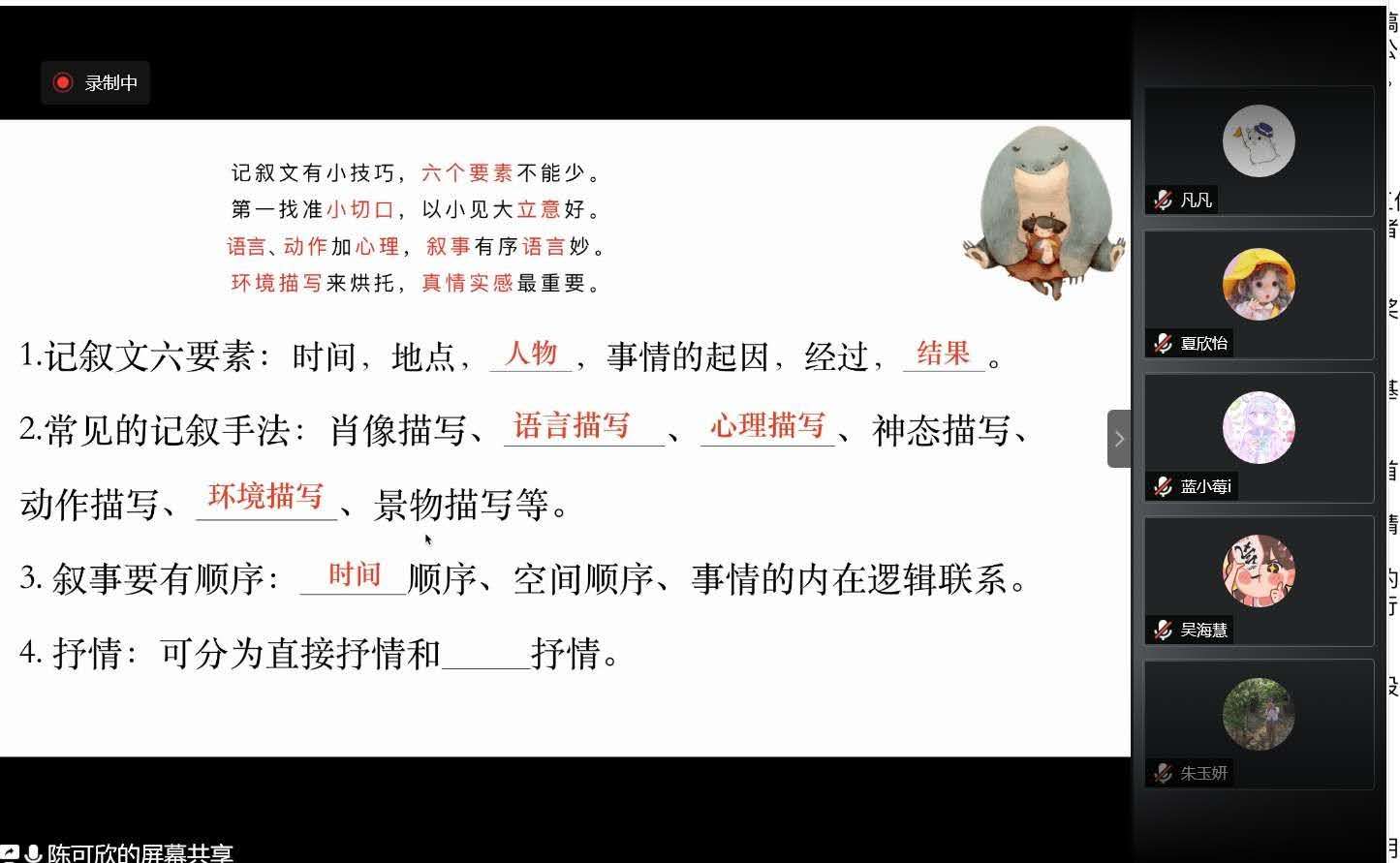 云朵課堂第四期特色課堂在下午三時許開始,文欣青協(xié)的志愿者們提前進入騰訊會議進行設(shè)備調(diào)試。下午三時十分,特色課堂第一部分開始,負(fù)責(zé)主講的志愿者賈梁同學(xué)向聽課的學(xué)生提出“你知道的抗‘疫’模范有哪些”的問題,與小朋友們開麥互動,并給出兩個抗“疫”事例,帶領(lǐng)學(xué)生一起學(xué)習(xí)疫情之下身邊人的抗疫精神,并講述如何使寫作不再像“流水賬”。第二部分由陳可欣同學(xué)主講,陳可欣同學(xué)給學(xué)生們講述記敘文的定義和記敘文六要素,并請學(xué)生們開麥答問題,巧妙將寫作重心轉(zhuǎn)向疫情之下的“我們”。接著,陳可欣同學(xué)以文章《門外有回音》為例,講述記敘文寫作的切口,并給學(xué)生們布置了小練筆作業(yè)。最后,主講人對前四次創(chuàng)意寫作小課堂的內(nèi)容進行了總結(jié),舉行了閉營儀式。下午四時整,特色課堂全部結(jié)束,文欣青協(xié)的志愿者們與參與活動的孩子們道別。