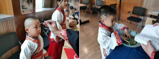 開筆禮儀上,學(xué)生代表首先向大成至圣先師孔子敬奉六禮,老師們則在孩子們的額頭正中心輕輕點下一顆“朱砂痣”。“朱砂啟智”又稱“開天眼”。“痣”通“智”,意為開啟智慧,以此寄托美好的愿望,從此眼明心亮,好讀書、讀好書、讀書好;遠(yuǎn)大的志向,需要從小事做起,日積月累,才能做成一番大事,接著,孩子們誦讀弟子規(guī),傳承中華文化;“鳴”通“明”,“鳴志” 即“明志”,就是表明自己的志向,擊鼓鳴志環(huán)節(jié)中,孩子們擊鼓的聲音越響,聲音傳得越遠(yuǎn),說明志向就越遠(yuǎn)大;“人生聰明識字始”,寫字識字是學(xué)習(xí)文化的第一步,最后一項是起筆頓悟,簡單而意義深遠(yuǎn)的大楷“人”字,寓意著在人生的啟蒙階段學(xué)會做人,堂堂正正立身,像“人”字那樣頂天立地。這楷體的“人”字的一撇一捺相互挨著,方能立穩(wěn),為人在世,就應(yīng)該互相支持,互相幫助,才能構(gòu)成和諧社會。