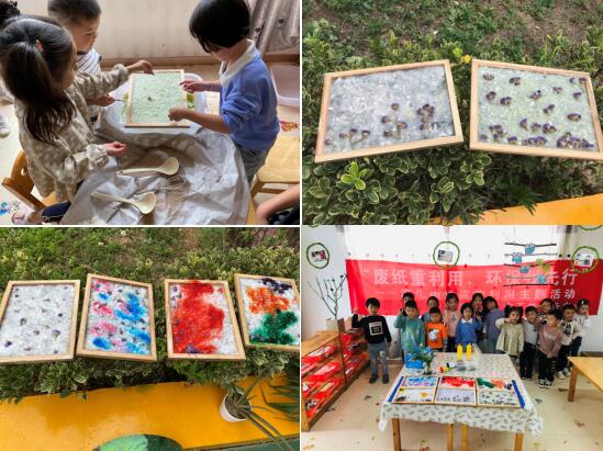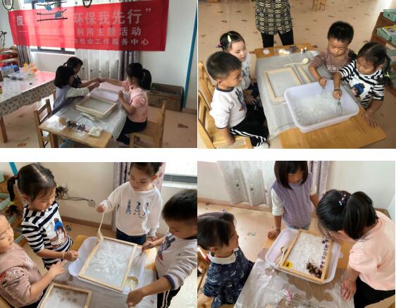 廢舊紙張,華麗變身。上午9點半,社工和志愿者來到茶崗幼兒園,掛橫幅、分配好活動所需物資。首先,社工向孩子們講解了造紙的理論知識和發(fā)展歷程,加強兒童對造紙文化的了解。隨后,將孩子們進行分組,讓孩子們在相互配合下完成今天的利用廢紙重新造紙的活動。孩子們將提前浸濕的廢紙傾倒在水盆里,充分攪拌,形成紙漿,再將紙漿舀到造紙網(wǎng)框中鋪平,接著用顏料、干花、亮片進行裝飾,最后再澆一層薄薄的紙漿將干花固定,等待曬干后,這一張張獨一無二的花草紙就在兒童們的巧手下誕生了,廢舊的紙張也重新獲得了第二次“生命”!