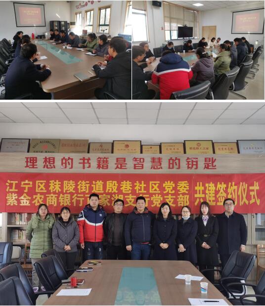 為加強(qiáng)村銀聯(lián)動(dòng),加強(qiáng)黨建學(xué)習(xí),構(gòu)建長期互助機(jī)制,實(shí)施鄉(xiāng)村振興戰(zhàn)略、率先基本實(shí)現(xiàn)農(nóng)業(yè)農(nóng)村現(xiàn)代化奠定堅(jiān)實(shí)基礎(chǔ),12月17日上午,江寧區(qū)秣陵街道殷巷社區(qū)黨委與紫金農(nóng)商銀行百家湖支行黨支部達(dá)成共建意向,舉辦簽約活動(dòng),并舉行了第一次主題黨日活動(dòng)。