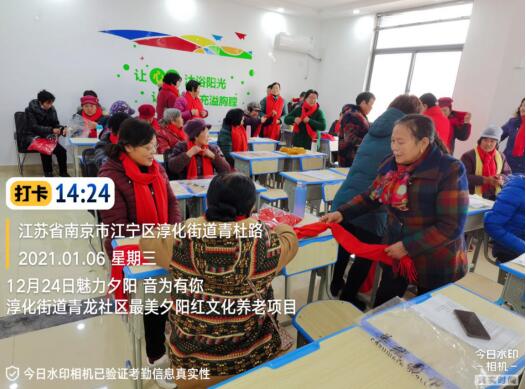 活動結(jié)束,社工給每位參加活動的老年人發(fā)放新年禮物——喜慶的大紅圍巾,老年人臉上洋溢著幸福的笑容,如同天邊那最美的夕陽紅。