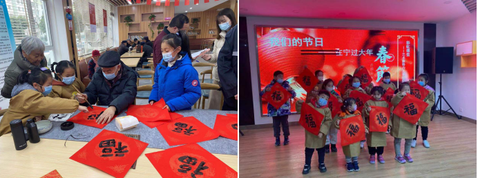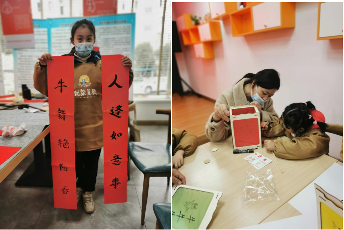 貼春聯(lián),是我國辭舊歲納新福、喜迎新春佳節(jié)的傳統(tǒng)習(xí)俗。家家戶戶過年時,都要貼春聯(lián),是每年新春佳節(jié)到來之際的一道文化“大餐”?;顒蝇F(xiàn)場,筆墨飄香,孩子們在志愿者的教導(dǎo)下,各顯身手,在紅彤彤的紙上,寫下一幅幅充滿美好祝愿的春聯(lián)以及一個又一個蒼勁有力的“福”?,F(xiàn)場氣氛歡樂喜慶,其樂融融,為即將來臨的新春佳節(jié)營造出濃濃的喜慶氛圍。“我要用什么材料搭架子呢?”“要怎么做這個燈籠掛穗呢?”在制作燈籠環(huán)節(jié)中,孩子們在志愿者的幫助下,積極動手,結(jié)伴一起剪紙、貼畫、即興大涂鴉等經(jīng)過一個小時的努力,一個個帶有年味的燈籠做出成型,整個活動室濃濃的節(jié)日氛圍撲面而來。