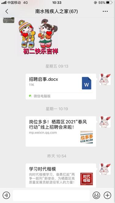 在“南水殘疾人之家”微信群中,社區(qū)殘聯(lián)工作人員在線上推送招聘會(huì)殘疾人用工招聘信息,為殘疾人求職者提供就業(yè)信息互通的渠道,幫助有就業(yè)意愿和就業(yè)能力的殘疾人實(shí)現(xiàn)就業(yè)創(chuàng)業(yè),全力保障特殊時(shí)期殘疾人獲取實(shí)時(shí)有效的就業(yè)服務(wù)。面對(duì)殘疾人求職者的就業(yè)創(chuàng)業(yè)政策咨詢,工作人員及時(shí)回復(fù)解答。“全程不見面,就業(yè)服務(wù)不間斷”南水新村社區(qū)依托電話、微信等媒介多舉措切實(shí)加強(qiáng)疫情期間的殘疾人就業(yè)服務(wù)工作,為殘疾人就業(yè)創(chuàng)業(yè)提供貼心服務(wù),營造殘疾人就業(yè)創(chuàng)業(yè)的良好社會(huì)氛圍。