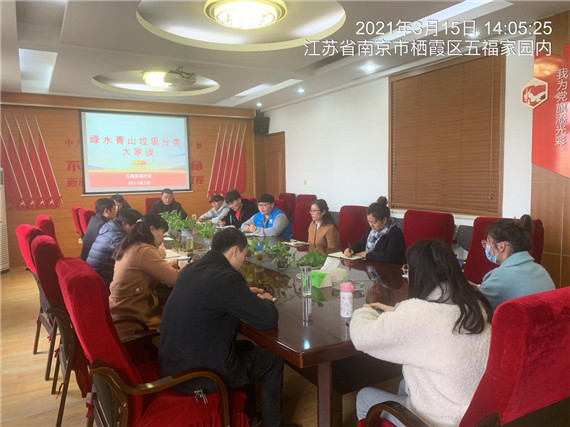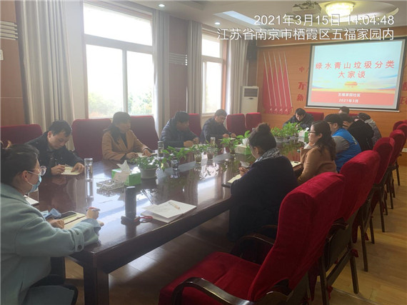 為貫徹鞏固“綠水青山就是金山銀山”發(fā)展理念,3月15日下午,南京市棲霞區(qū)棲霞街道五福家園社區(qū)在社區(qū)二樓會議室組織了“綠水青山大家談”活動。社區(qū)黨委班子成員以及其他相關(guān)工作人員積極參與會議活動。