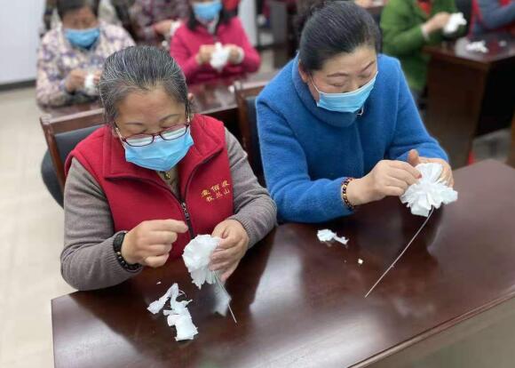 活動現(xiàn)場,在志愿者的示范指導(dǎo)下,大家按部就班,用準白好的面紙、剪刀和繩線,認真翻折出一朵朵層層疊疊的小白花,每一朵圣潔的小白花都凝聚了大家對先輩的一片緬懷之情,一份崇敬之意。隨后是全體起立,為革命先輩們集體默哀一分鐘。