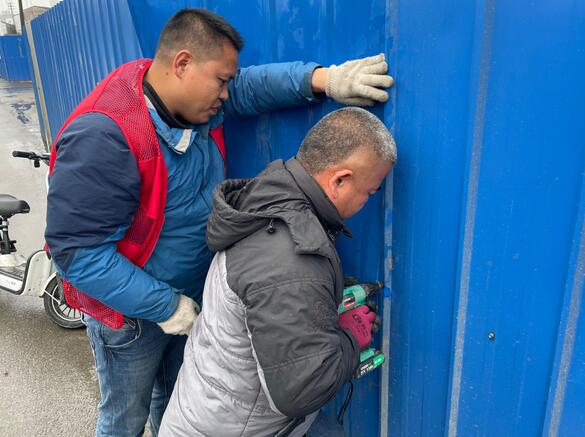 社區(qū)接到電話后第一時間組織社區(qū)工作人員帶上工具前往現(xiàn)場,發(fā)現(xiàn)部分圍擋出現(xiàn)被風(fēng)吹倒、傾斜、人為破損等現(xiàn)象,給出行的車輛和行人造成安全隱患。針對圍擋存在的問題,工作人員多措并舉,根據(jù)圍擋的類型、材質(zhì)、大小以及破損的程度等情況采取相應(yīng)的處理方法。一是利用鐵絲、扳手、老虎鉗等工具對輕微處進(jìn)行修補,共修復(fù)5處。二是對嚴(yán)重破損的直接清除,并對圍擋加固,及時消除安全隱患,保障廣大居民的出行安全。
