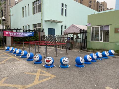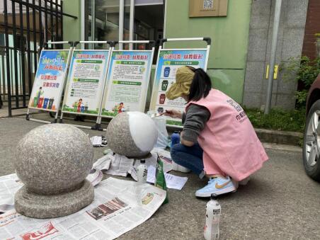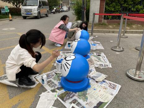 轄區(qū)內(nèi)的九鄉(xiāng)雅苑幼兒園門口共有15個石球,其功能是阻止車輛穿行,但是水磨石冷冰冰光禿禿的表面有煞風景?;顒忧捌冢鐓^(qū)婦聯(lián)、社會組織、幼兒園進行了前期溝通,結(jié)合幼兒園自身的特色,多次溝通后選定了多啦A夢的彩繪方案。