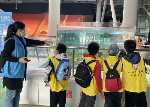 “這只在水中靈巧游動的機器魚,就是由傳感器、電機、中央控制系統(tǒng)共同協(xié)調控制完成的。大家可以想一想,這項技術可以幫助人類做哪些事情呢?”南京市棲霞區(qū)棲霞街道南煉新村社區(qū)的科普志愿者王巧先向孩子們解釋面前這個巨大水缸中的機器魚運動原理,并拋出問題,鼓勵大家思考。
