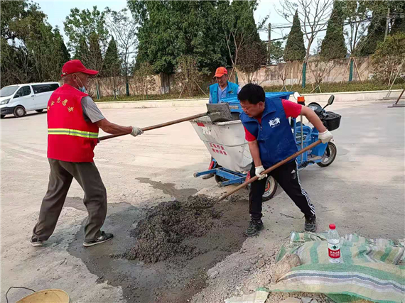 社區(qū)積極協(xié)調、多方溝通,面對路面的“不平”, 志愿者們帶上了鐵鍬、泥土沙石等工具主動當起了修路工人,掄著鐵鍬將路面上的碎石敲開、清理,然后用水泥攪拌著細沙將凹陷處澆灌、填滿、鋪平,最后再用平鏟敲打嚴實。經(jīng)過大家的努力,路面恢復了平整,交通也變得更加順暢了。
