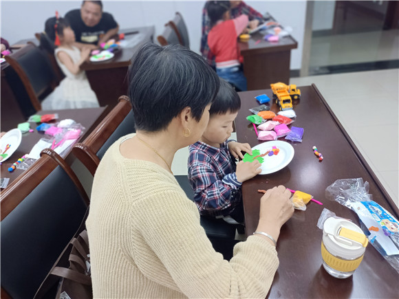課上,社區(qū)志愿者老師首先通過(guò)提問(wèn)互動(dòng)的形式,了解了大家對(duì)綠色和環(huán)境保護(hù)的理解,并舉例讓大家對(duì)居民的一些生活行為進(jìn)行了評(píng)斷,呼吁大家文明生活,自覺(jué)愛(ài)護(hù)身邊環(huán)境。隨后,跟隨志愿者老師的講解和示范,家長(zhǎng)和孩子們齊動(dòng)手,揉、捏、粘、貼……合力完成紙盤彩泥作品,少兒們一一上臺(tái)介紹了自己的作品。綠綠的草地、五彩的花朵、悠閑的毛毛蟲(chóng)、可愛(ài)的蘑菇等讓大家體會(huì)了自然和諧的美麗和環(huán)保的重要性。