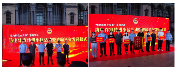 5月27日晚,南京市江寧區(qū)東山街道邵圣社區(qū)聯(lián)合大黨委成員單位岔路派出所開展主題“我為群眾辦實事-防電詐宣傳進小區(qū)活動暨被騙資金發(fā)還儀式”主題活動。