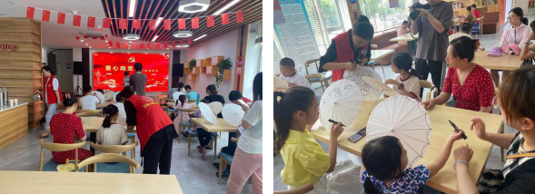 活動現(xiàn)場,志愿者貼心的為大家準(zhǔn)備好了活動所需的材料,油紙傘、顏料筆、顏料盤。活動以“巧手變美圖”開始,家長與孩子一同將相同的空白圖案進(jìn)行填充變成其他的圖案。每個孩子心中都有一個創(chuàng)造力精靈,孩子們自由發(fā)揮,盡情想象,利用各種色彩搭配,將紙傘裝飾得五彩繽紛。經(jīng)過1個小時的創(chuàng)作之后,各式各樣的油紙傘印入眼前。經(jīng)過家長與孩子之間配合,一把把美麗、獨特且富有創(chuàng)意的油紙傘呈現(xiàn)在了大家的面前。完成的家庭紛紛拿起自己的作品進(jìn)行拍照留念并向大家分享了自己感受和收獲。
