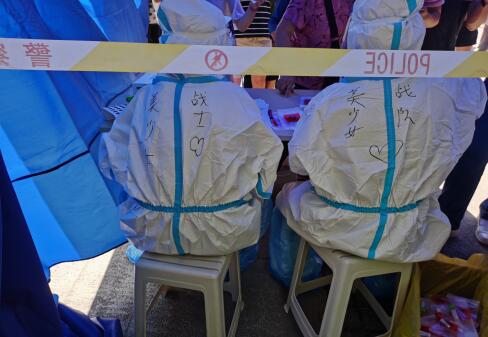 與此同時,醫(yī)護(hù)人員穿著一層層的防護(hù)服,堅(jiān)守著工作崗位,一絲不茍地為大家進(jìn)行核酸采樣。取出棉簽,讓大家張嘴,前后過程很迅速,但這也是醫(yī)護(hù)人員工作辛苦熟練以及被檢測人員積極配合的體現(xiàn)。有兩個醫(yī)護(hù)人員的防護(hù)服上寫著美少女戰(zhàn)士,呼應(yīng)了當(dāng)下的情形,也給緊張的核酸檢測工作增添了一份色彩。