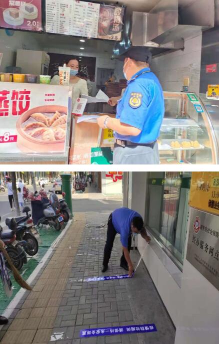 持續(xù)加大日常巡查力度,抓好對轄區(qū)內(nèi)沿街商鋪、大型商超、農(nóng)貿(mào)市場等重點(diǎn)區(qū)域的巡查管控,要求每日進(jìn)行不少于2次的消毒消殺和體溫測量,每次進(jìn)行不少于30分鐘的通風(fēng)換氣,做好信息記錄,對檢查中發(fā)現(xiàn)的防疫落實(shí)不到位的責(zé)令其立即整改到位。同時安排人員在沿街門店醒目位置張貼“請佩戴口罩入場”的溫馨提示,對不佩戴口罩者,拒絕入內(nèi);在商超入口、收銀臺等處張貼“一米線”標(biāo)識,提醒居民自覺保持安全距離排隊(duì),確保人員無近距離接觸,筑牢疫情防控安全防線。