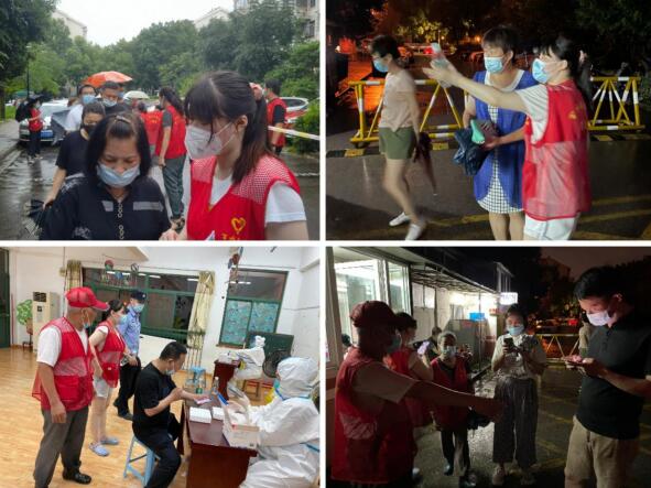 家住百水家園小區(qū)的老黨員周紹銀,今年78歲,黨齡51年,他是黨小組長(zhǎng)、社區(qū)的平安志愿者、“博愛(ài)家園”志愿者。他一直熱心社區(qū)事務(wù),在他的感染下,他的愛(ài)人顧愛(ài)美也加入了社區(qū)志愿者隊(duì)伍,參與到社區(qū)的治安巡邏中。南京疫情爆發(fā)之后,周師傅第一個(gè)響應(yīng)社區(qū)號(hào)召,毅然加入社區(qū)疫情防控工作,在醫(yī)務(wù)工作者、社區(qū)工作人員徹夜為居民做核酸檢測(cè)時(shí),年近80歲的他也跟著一起維護(hù)秩序到深夜。第二輪檢測(cè)開(kāi)始后,因?yàn)槿蝿?wù)緊,社區(qū)人手嚴(yán)重不足,周師傅還叫來(lái)了她的孫女顧瀅做志愿者。采集當(dāng)天,因?yàn)榕_(tái)風(fēng)影響,南京下起了暴雨,祖孫二人冒著雨,爺爺在現(xiàn)場(chǎng)維持秩序,孫女則幫助不會(huì)使用微信的老年人注冊(cè)核酸檢測(cè)采集碼,忙得渾身濕透卻毫無(wú)怨言。到了夜里,周師傅的愛(ài)人也在執(zhí)勤之余跑來(lái)幫忙。祖孫三人,用責(zé)任與擔(dān)當(dāng)守護(hù)著我們的生命,堅(jiān)守著我們的家園。三人穿著一樣的紅馬甲站在一起,形成了一道溫馨而亮麗的風(fēng)景線。