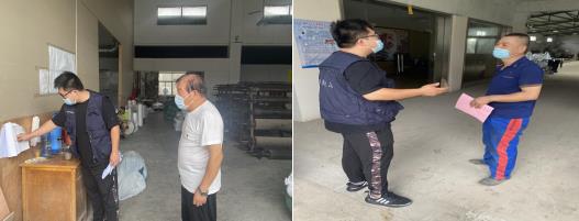 近日,南京市江寧區(qū)湖熟街道東陽(yáng)社區(qū)專職安全員與網(wǎng)格員去到轄區(qū)內(nèi)企業(yè)進(jìn)行“疫情防控”與“安全生產(chǎn)”工作的宣傳與指導(dǎo)。社區(qū)專職安全員現(xiàn)場(chǎng)指導(dǎo)企業(yè)負(fù)責(zé)人嚴(yán)格落實(shí)疫情防控工作相關(guān)規(guī)定,堅(jiān)持做好來(lái)訪人員登記、員工日常體溫測(cè)量、廠區(qū)消殺以及口罩發(fā)放等工作。