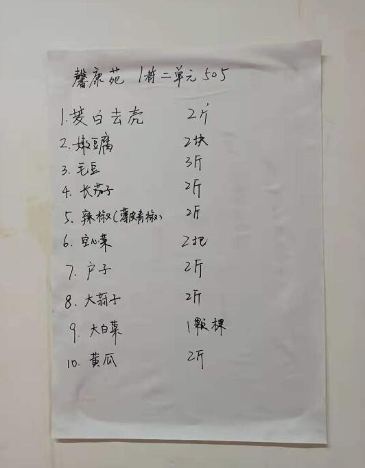 “茭白去殼2斤、嫩豆腐2塊、毛豆3斤、長茄子2斤、薄皮辣椒2斤......”在南京市棲霞區(qū)馬群街道馨康苑社區(qū)辦公點有這樣一張菜單,看是普通的背后,卻蘊藏著一段溫暖的防疫故事。