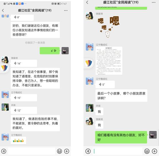 因為疫情防控的要求,本次活動在線上微信群進(jìn)行,工作人員將一個個經(jīng)典紅色故事通過語音以及電子文檔的形式向在線的小朋友們講解,引導(dǎo)小朋友們在閱讀后分享自己的感想與筆記。“在這個故事里,我懂得了在危險的時刻要保持冷靜,舍己為人,不能緊張,要想一些聰明的辦法。”“這句話的意思和我讀過的一句古詩很相似,‘生當(dāng)作人杰,死亦為鬼雄’。”……微信群里,小朋友們各抒己見,討論地?zé)峄鸪?,工作人員紛紛為他們的感想點贊。