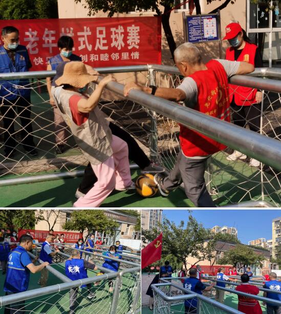 9月6日,讓居民們期待已久的欄式足球終于露出了廬山真面目。欄式足球以其適合老年人的“安全、健身、趣味、和睦鄰里”的特點,在許多老年人之中備受歡迎。整個“足球場”占地不過十幾平方米,由幾根欄桿和球門組成。沙書記率先拿著足球,為大家講解游戲規(guī)則,并邀請10名居民參與游戲演示,在場的老人們踴躍報名,居民們也紛紛下場親身感受游戲的樂趣。“5個人一組,一個守門員。叔叔阿姨站好位置,扶好欄桿,注意安全。我們的目標是把球踢進對方的球門里……”在沙書記講解完后,游戲正式開始。叔叔阿姨們很快掌握了游戲規(guī)則,各個精神矍鑠,很快就拿下比賽的第一分??吹嚼先藗儗@個項目興趣盎然,沙書記提議往后可以經(jīng)常開展小區(qū)居民之間的比賽,通過游戲促進中老年人的身體健康,大大提高居民凝聚力,得到了老人和居民的支持。