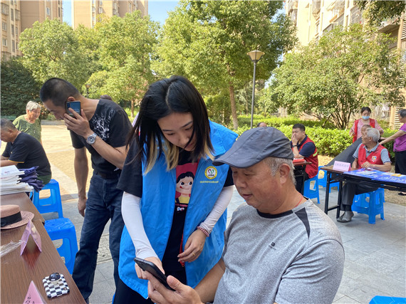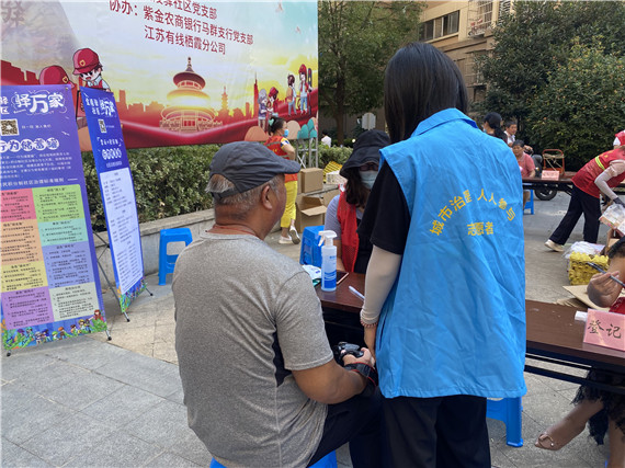 在活動現(xiàn)場工作人員協(xié)助居民完成南京市垃圾分類小程序平臺注冊,志愿者給居民發(fā)放宣傳手冊,并用通俗易懂的語言,簡單明了地向居民介紹垃圾分類知識,“剩飯剩菜、果皮菜葉放在綠色桶里……”呼吁居民積極進(jìn)行垃圾分類,養(yǎng)成垃圾分類的好習(xí)慣,共創(chuàng)和諧美好家園。現(xiàn)場還設(shè)置了垃圾分類知識問答區(qū),吸引了不少居民參與,每答對一題,則獲得環(huán)保袋一個。